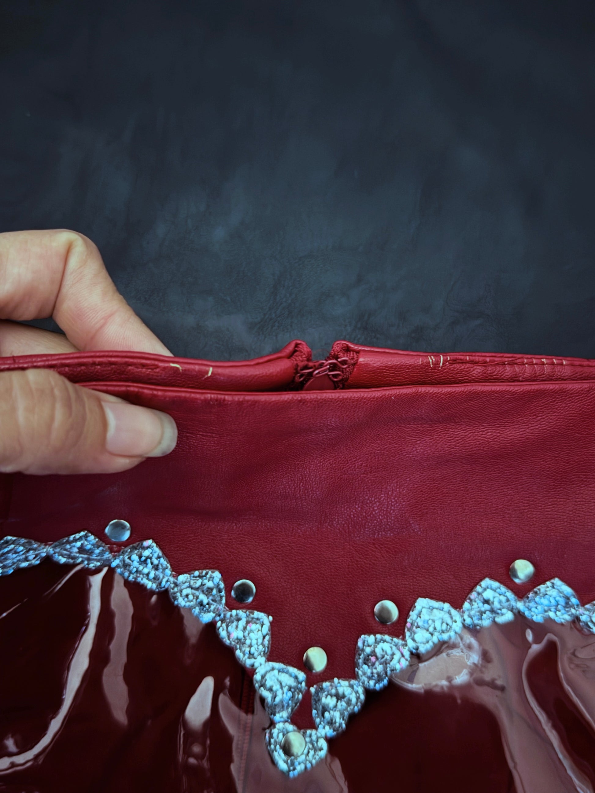 Upclycled Second hand skirt • Faux Leather in a Deep burgundy • Does have some Distress! Please see photos!** Treated with Leather Paint. See Last photo for best color accuracy.